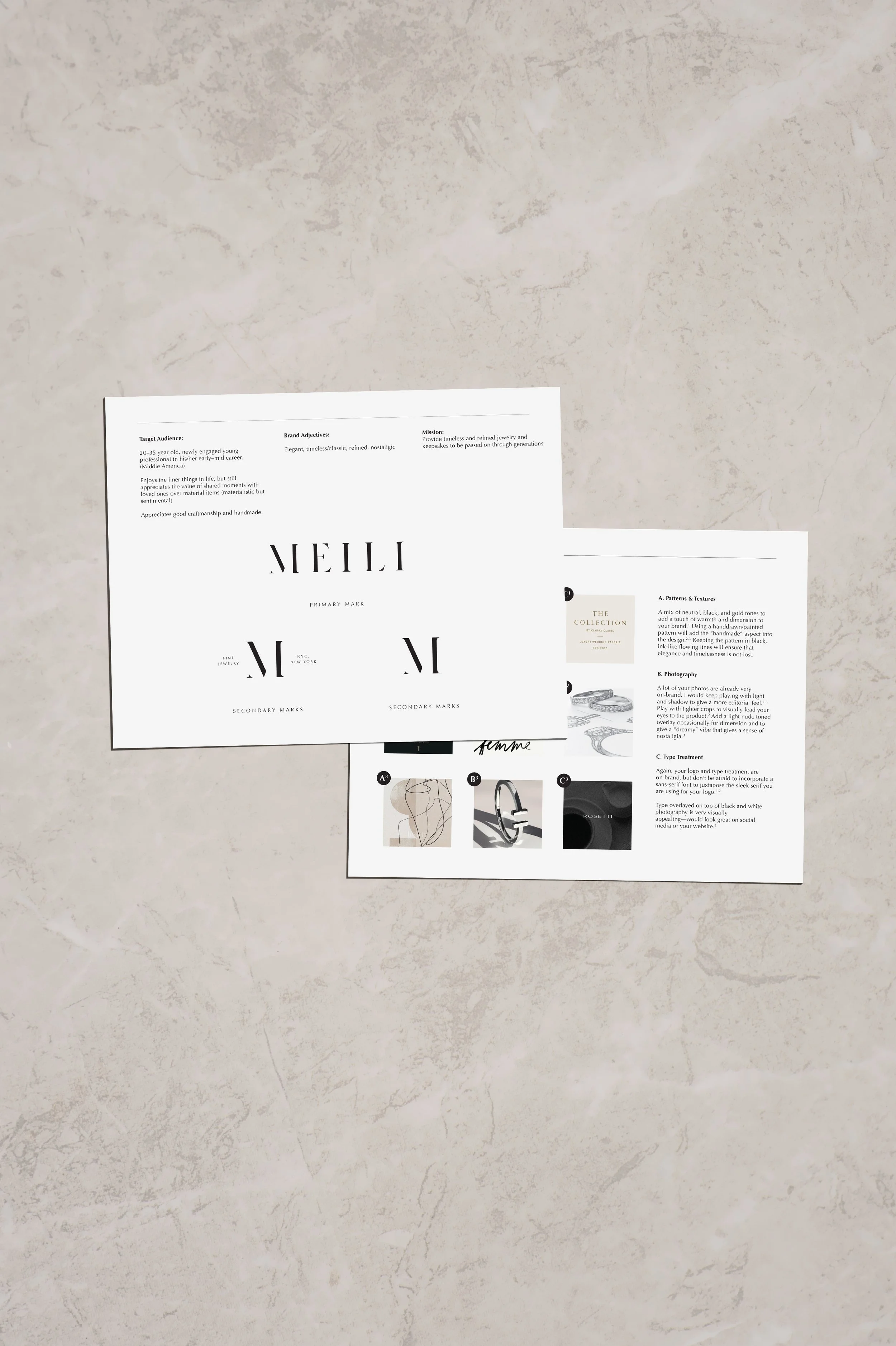 I developed a black-and-white color palette accented with warm tones and metal tones to evoke the emotional significance of heirloom pieces and the materials used in jewelry itself. Rich textures and hand-lettered patterns round out the identity to subtly highlight the brand’s handcrafted process.